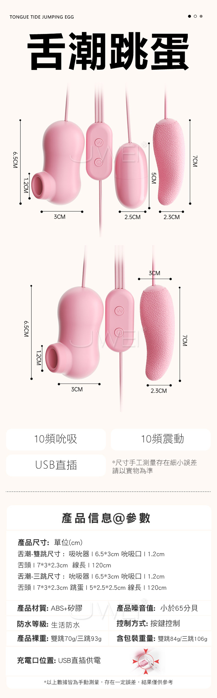 舌潮跳蛋 吸震一體,內外共潮 多點刺激,1+1>2的快樂 綿柔吮吸 動感裹吸,軟糯小嘴 緊緊包裹蜜豆,嘬吸C點 喚醒敏感神經 10頻強震,深入密道探索,多重頻率強震圍攻G點,花樣潮玩 震的狠 多面刺激 強韌拉繩 玩的安心,加選材質不易斷 多份放心,USB直插 方便快捷 強勁續航! 產品規格 ■材質: 矽膠+ABS ■規格: 詳如圖片標示 ■功能: 10頻吮吸、10頻強震、USB直插