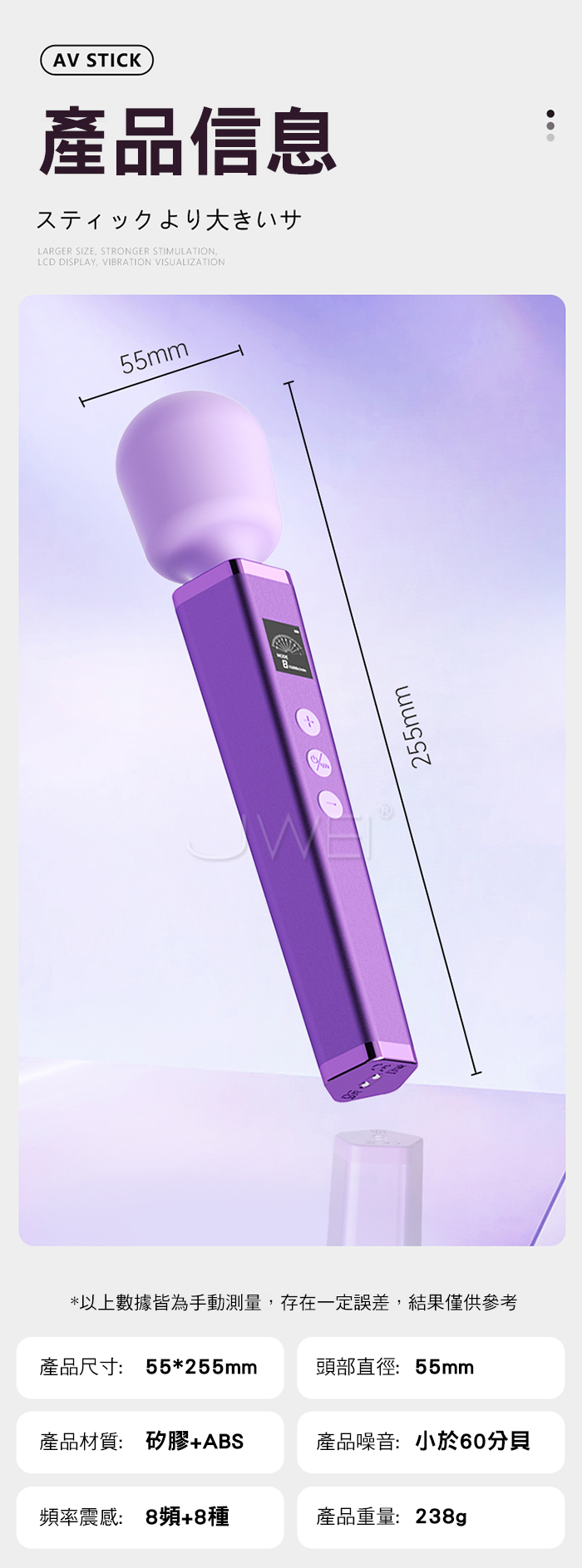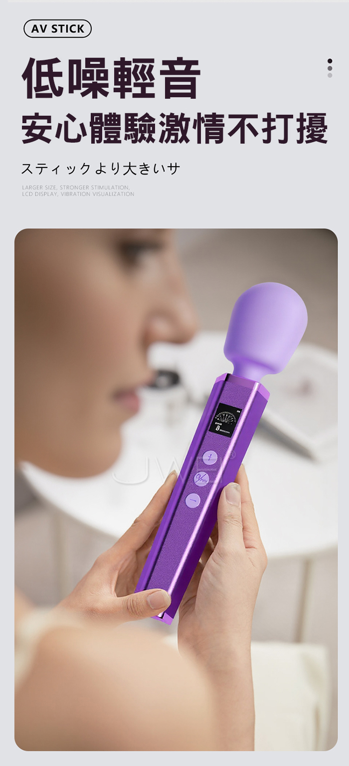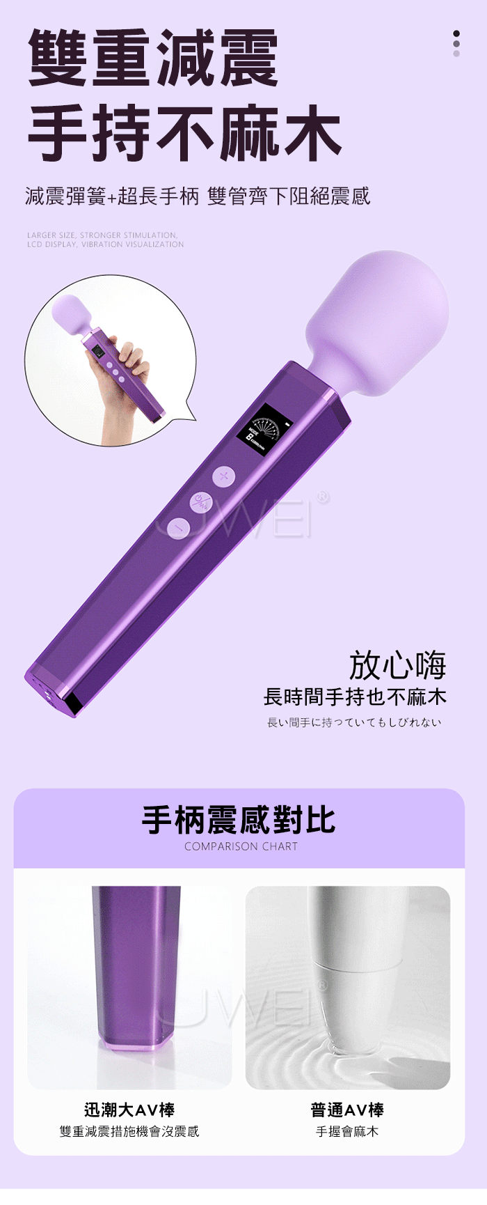 迅潮大AV棒,強震陰蒂,迅潮淪陷,無法抗拒的震震高潮體驗 雙重減震,手持不麻木,減震彈簧+超長手柄 雙管齊下阻絕震感 靈活大頭,360度旋轉 接觸面積更大,刺激角度更多,使用感受更爽 高階液晶顯示器,可視化快感衝擊,液晶螢幕即時顯示,見證高潮來襲時的強度數據 產品規格 ■材質: 矽膠+ABS ■規格: 詳如圖片標示 ■功能: 8頻震動、8級強度