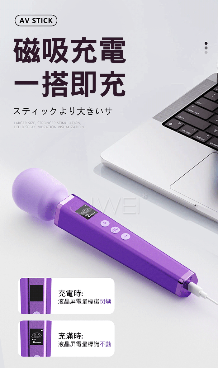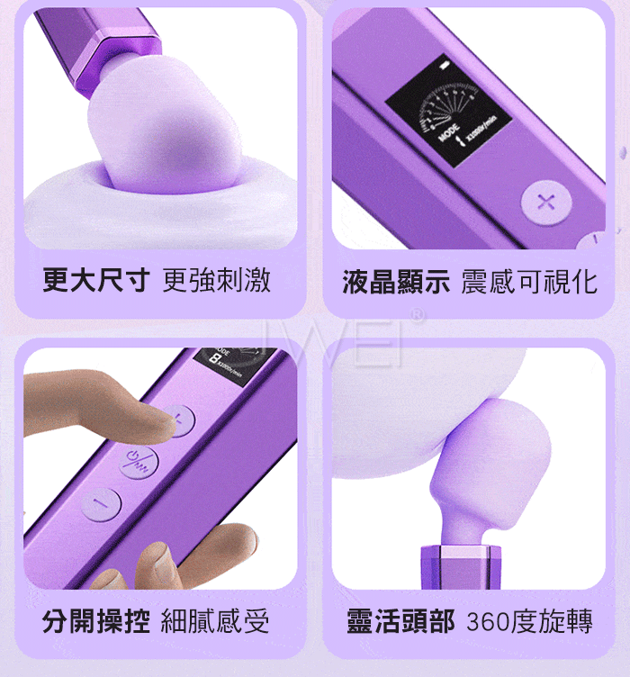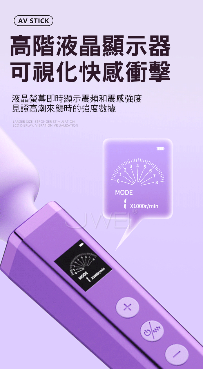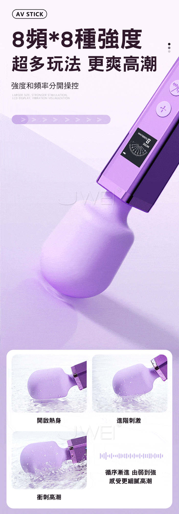 迅潮大AV棒,強震陰蒂,迅潮淪陷,無法抗拒的震震高潮體驗 雙重減震,手持不麻木,減震彈簧+超長手柄 雙管齊下阻絕震感 靈活大頭,360度旋轉 接觸面積更大,刺激角度更多,使用感受更爽 高階液晶顯示器,可視化快感衝擊,液晶螢幕即時顯示,見證高潮來襲時的強度數據 產品規格 ■材質: 矽膠+ABS ■規格: 詳如圖片標示 ■功能: 8頻震動、8級強度