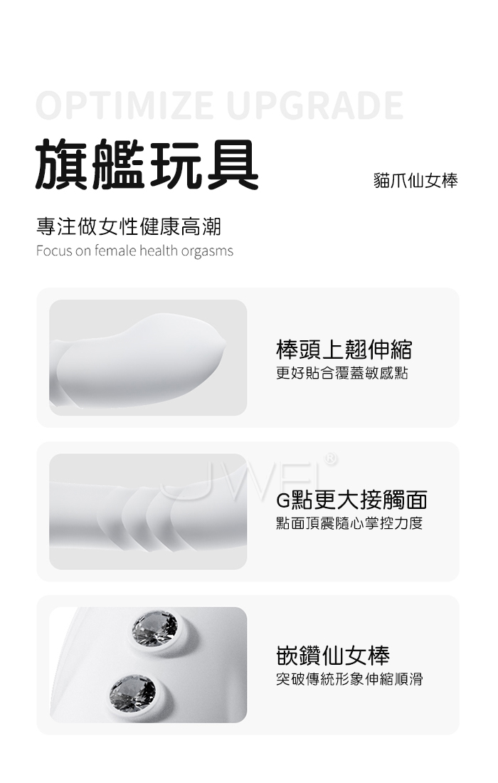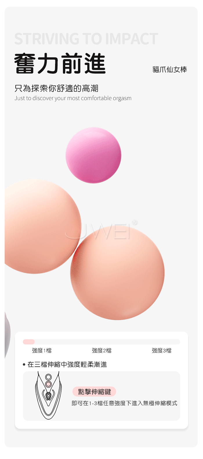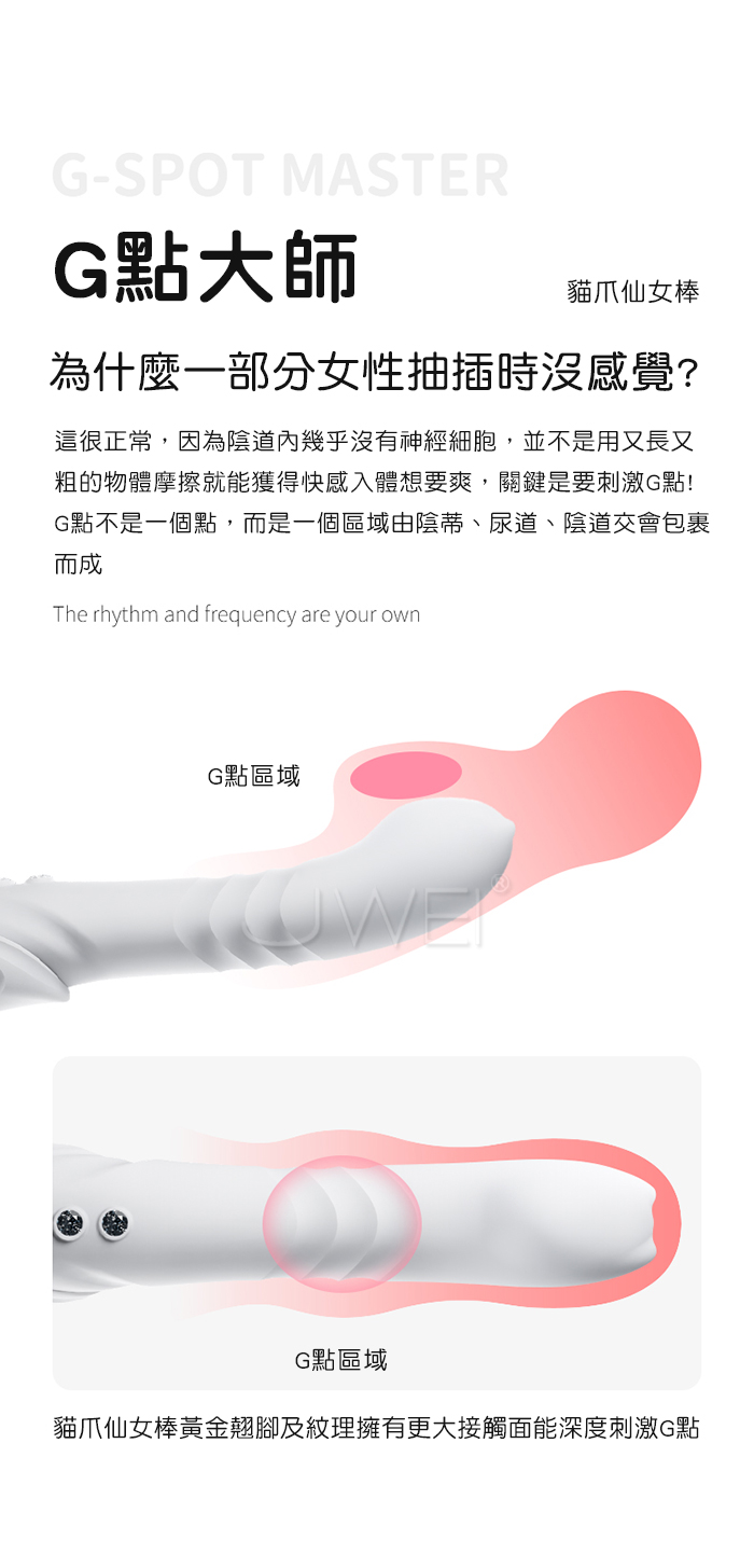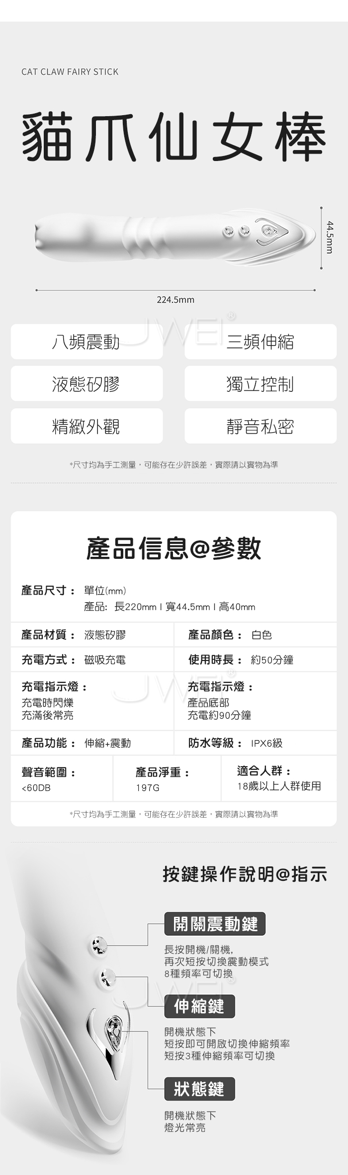 猫爪仙女棒 升起快感 燃點激情,打開愉悅門戶 3段奮力伸縮前進探縮高深處高潮,舒適震動自己掌握 M型接觸面,仿指尖觸感來回揉撥,紋理衝擊突破想像!! 產品規格 ■材質: ABS+矽膠 ■規格: 詳如圖片標示 ■特色: 3頻伸縮、8頻震動、加溫