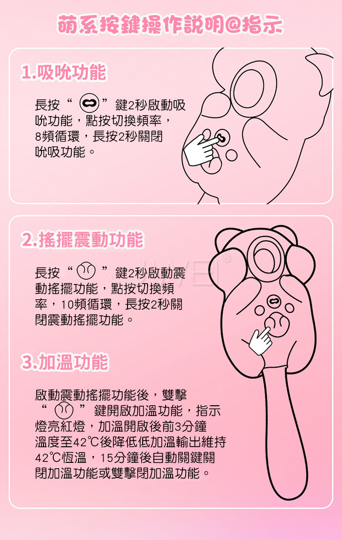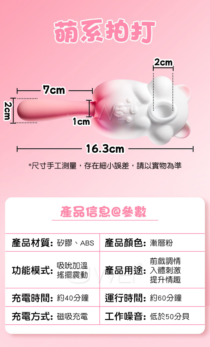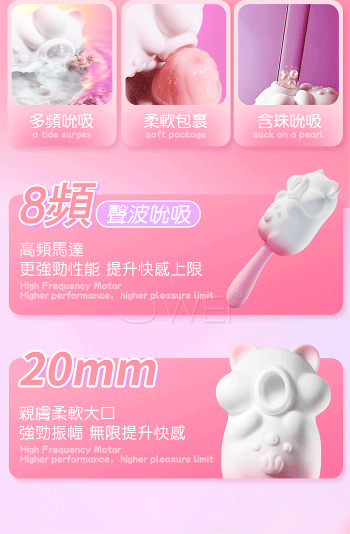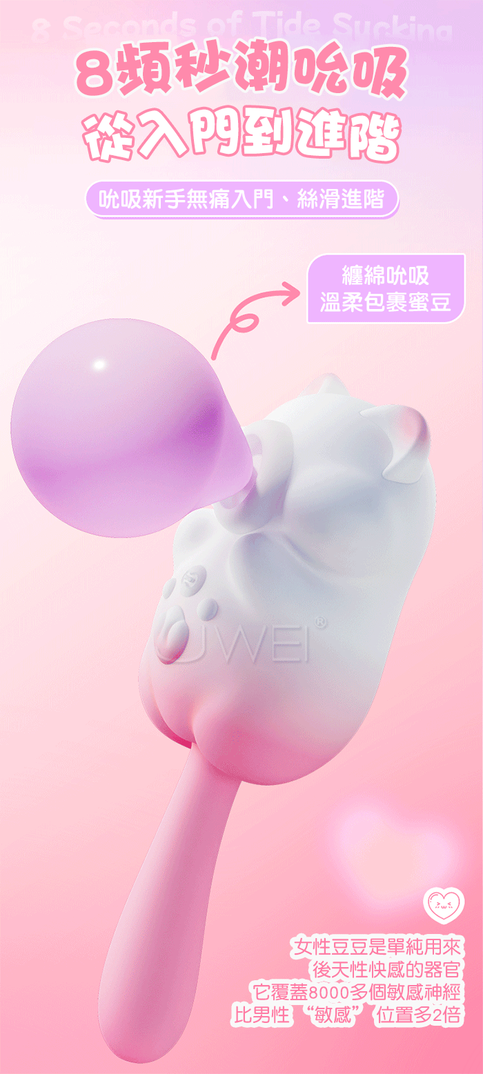 萌寵相伴,悦己上佳之選,與心跳同頻的悸動,一場獨屬於海洋的脈搏 8頻秒潮吮吸,從入門到進階,吮吸新手無痛入門、絲滑進階,温柔包裹蜜豆 一鍵尾部摇擺,深入刺激敏感點,沉浸其中 讓舒服一陣接一陣 震感延綿,春潮漣漣,溫柔挑逗到香汗淋漓~多種玩法,盡情釋放內在的壓力! 產品規格 ■材質: ABS+矽膠 ■規格: 詳如圖片標示 ■特色: 8頻舌舔、10頻震動
