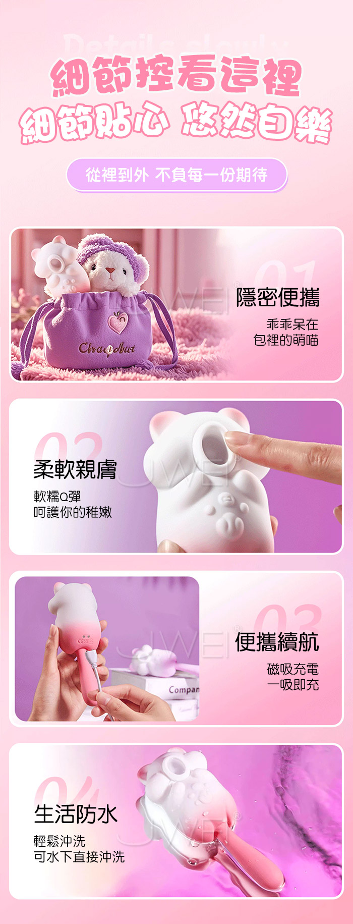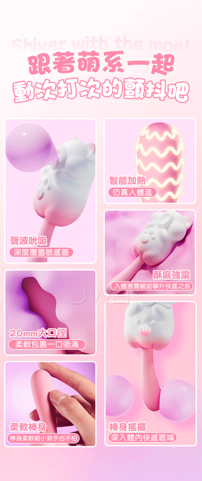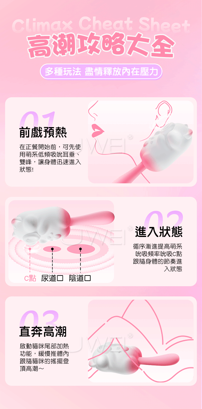 萌寵相伴,悦己上佳之選,與心跳同頻的悸動,一場獨屬於海洋的脈搏 8頻秒潮吮吸,從入門到進階,吮吸新手無痛入門、絲滑進階,温柔包裹蜜豆 一鍵尾部摇擺,深入刺激敏感點,沉浸其中 讓舒服一陣接一陣 震感延綿,春潮漣漣,溫柔挑逗到香汗淋漓~多種玩法,盡情釋放內在的壓力! 產品規格 ■材質: ABS+矽膠 ■規格: 詳如圖片標示 ■特色: 8頻舌舔、10頻震動