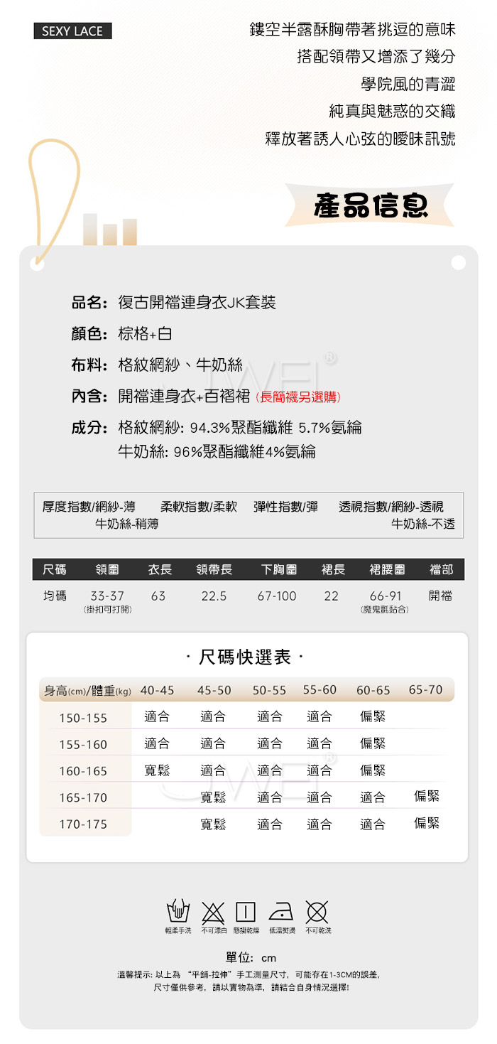 ■內容物:開襠連身衣+百褶裙 ■適穿尺寸:FREESIZE ■彈性:彈 ■未撐開平量尺寸正負誤差1~2cm,1吋=2.54cm ■注意事項:基於保障消費者個人衛生,此貼身衣物恕不接受退換貨。 (如為商品本身暇疵,接受七日內換貨,請勿試穿,謝謝您)